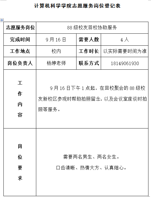 志愿服务岗位信息(9月16日)——万象城官网88级校友回校协助后勤服务