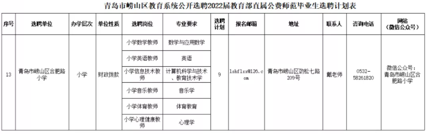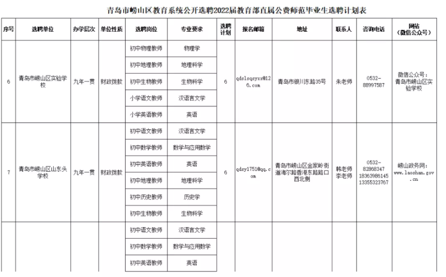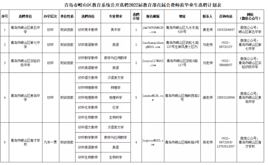 根据《事业单位人事管理条例》(国务院令第652号)《事业单位公开招聘人员暂行规定》(人事部令第6号)《国务院办公厅关于转发教育部等部门教育部直属师范大学师范生公费教育实施办法的通知》(国办发〔2018〕75号)等文件要求以及省、市有关规定,青岛市崂山区教育系统计划公开选聘2022届教育部直属公费师范毕业生(以下简称公费师范生)50人,详见《青岛市崂山区教育系统公开选聘2022届教育部直属公费师范毕业生选聘计划表》。现将有关事宜公告如下: