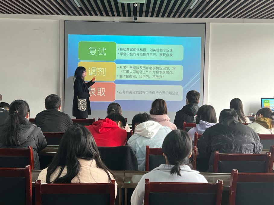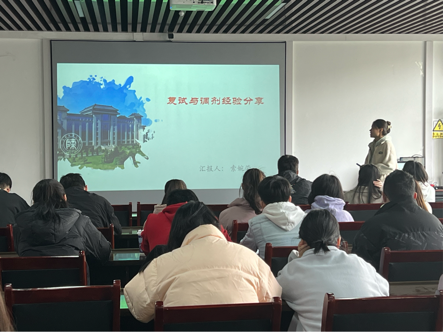 最后,陈昱莅鼓励同学们要积极准备复试,将以最大可能考上作为根本落脚点,保持自信,勇敢展示自我。对于复试的考察内容和形式做了指导,提示大家做有针对性的复习和准备。