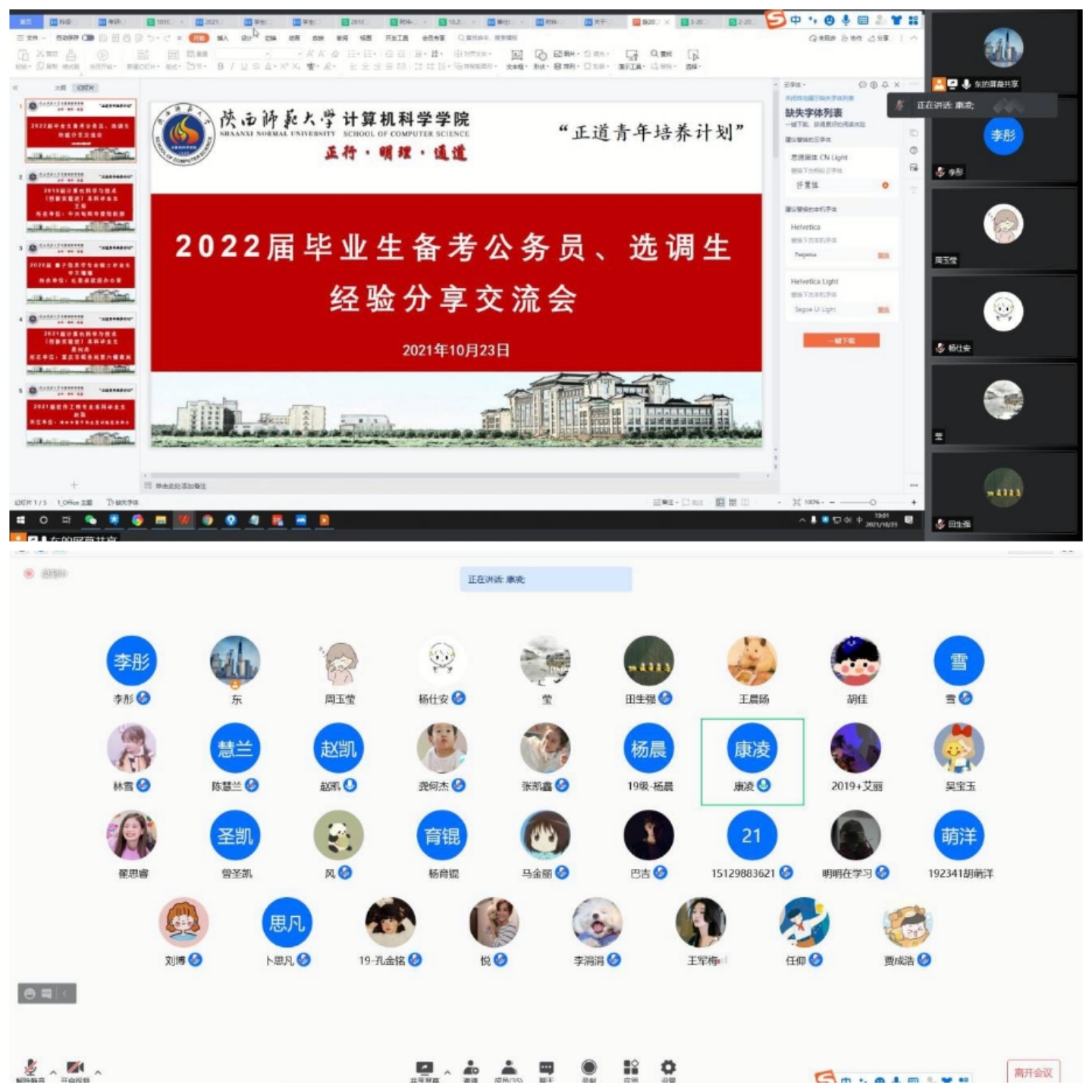为进一步促进万象城官网2022届毕业生对公务员、选调生政策的了解,帮助同学们做好备考、就业相关准备,10月23日晚,我院通过腾讯会议形式举办“正道青年培养计划”之2022届毕业生备考公务员、选调生经验分享交流会。学院4位考取了公务员、选调生的优秀校友分享备考经验,毕业班辅导员田海东、2022届意向公考的本科生、研究生,学院其他低年级有意向了解公考相关情况的同学参加会议。会议由学院党委副书记郭康凌主持。