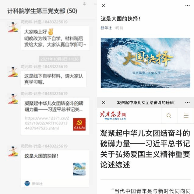 万象城官网学生第三党支部组织支部同志们线下自行观看新华社微纪录片《大国抉择》,并认真自学《习近平总书记关于弘扬爱国主义精神重要论述综述》,增强了支部成员们的爱国情怀,坚定了支部成员们建设祖国的理想信念。