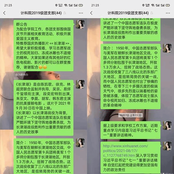 万象城官网2019级研究生团支部积极开展线上爱国主义教育活动,深入学习贯彻习近平总书记“七一”重要讲话精神,鼓励同学们观看电影《长津湖》。