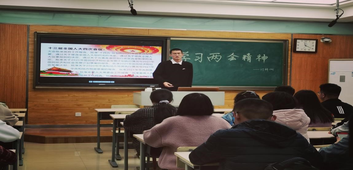 每一位同学认真了解两会,并从两会中得到启示,了解国情、了解社会变动、了解人民需求,更加懂得如何顺应时代的要求发展自己。活动开始前,同学们提前学习了相关内容,了解了两会的背景及意义。本次活动对继续加强青年大学习的效率和质量做了安排布置,了解了两会中的故事,几位同学提前准备了在两会中发生的“大思政课”,以故事的形式为同学们讲解,宣传委员利用qq、微信等平台进行了线上宣传。