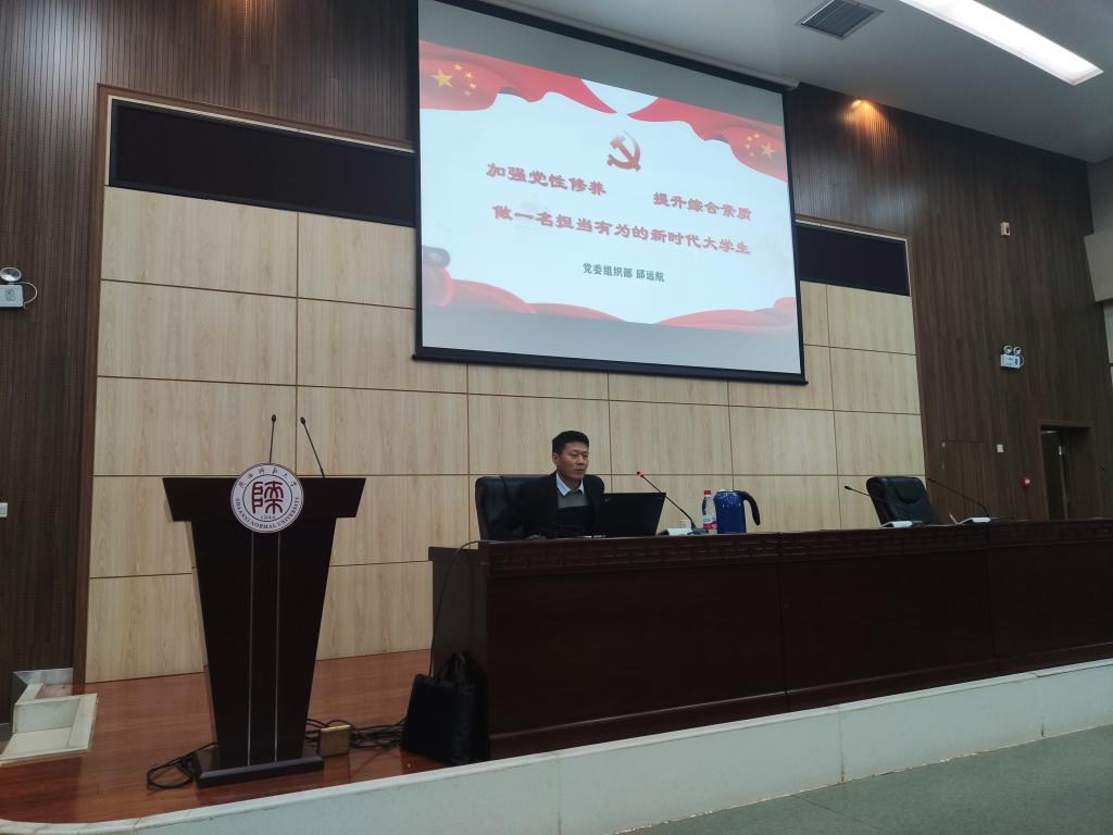 3月31日晚,万象城官网第34期入党积极分子培训班第五讲在文澜楼B段一层会议厅开讲。党委组织部组织员邱远航老师以《加强党性修养,提升综合素质》为题进行了授课。体育学院和万象城娱乐awc线路百余名入党积极分子参加,培训班由学院党委组织员郭康凌主持。