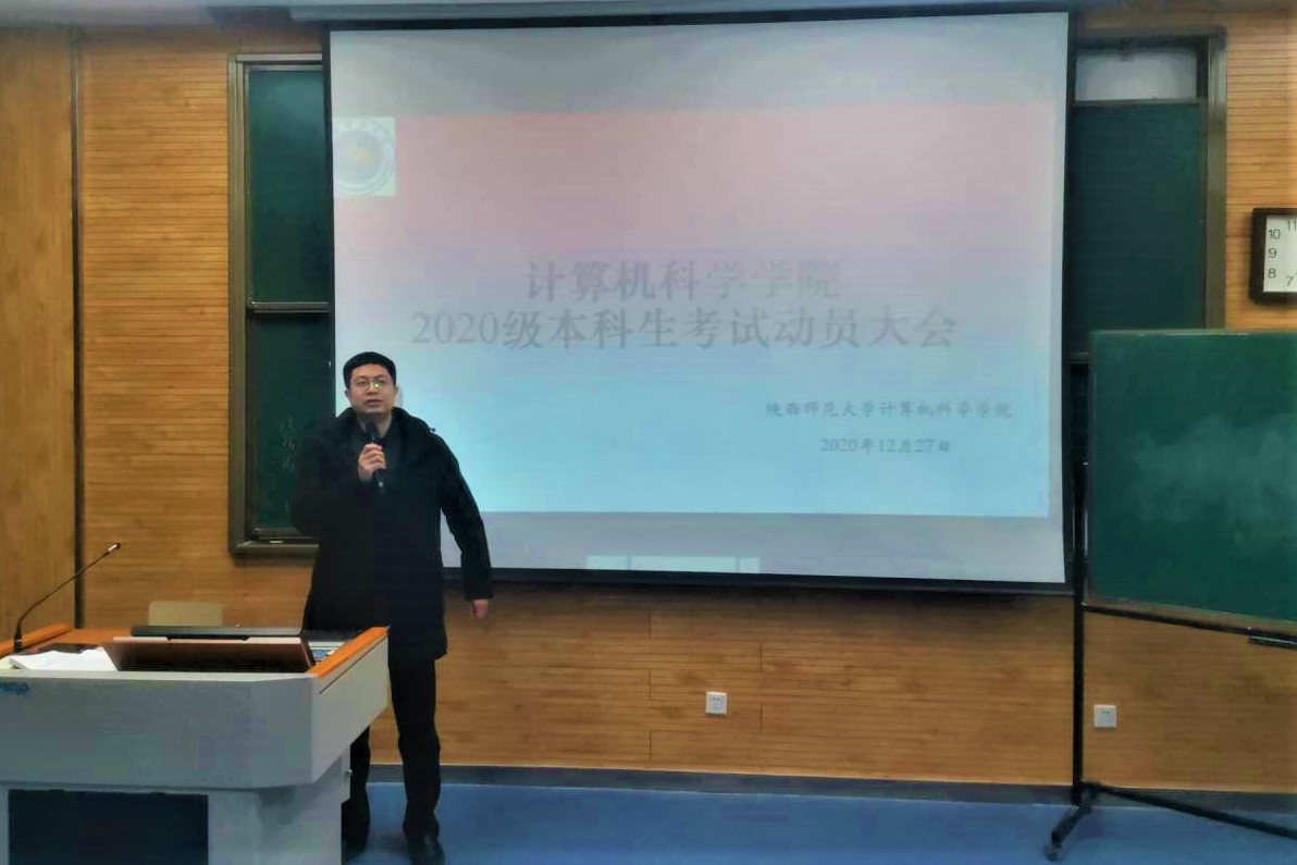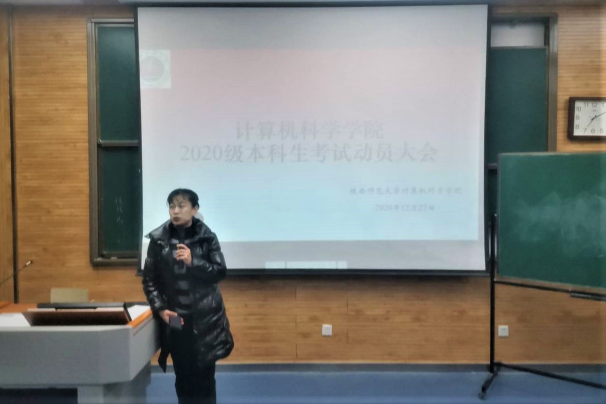 2020年12月27日晚19时,万象城娱乐awc线路2020级本科生考试动员大会在雁塔校区教学5楼5104教室顺利召开。本次大会由辅导员毛庆主持,万象城娱乐awc线路党委副书记袁冰老师、副院长李鹏老师和2020级全体同学参加了本次讲座。