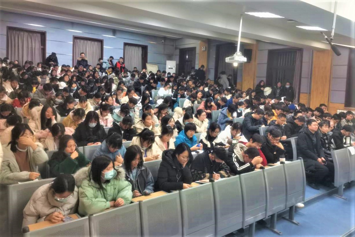 随后,袁冰副书记对同学们进行动员。袁冰副书记首先向同学们指出:近年来,考研形势越发严峻,同学们要好好学习,在期末考试中取得好成绩,争取保研。之后,袁冰副书记向同学们介绍了一些考试时的注意事项。最后,袁冰副书记为同学们简单地解读了《考试承诺书》。在谈及考试作弊时,袁冰副书记尤其强调,作弊会被记录在学生档案中,成为一生无法抹去的污点,希望同学们诚信考试,不要作弊。两位老师语言风趣幽默,现场气氛十分热烈。
