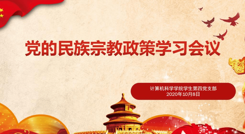为贯彻落实《中共万象城娱乐awc线路委员会迎接建党100周年行动方案》文件精神,庆祝新中国成立71周年,同时深入推动党的民族宗教政策学习教育活动,加强党员同志正确的国家观、民族观、宗教观、历史观和文化观教育,把党的民族宗教政策真正学懂弄通做实,学生第四党支部于10月8日晚在学院报告厅开展了以“学习党的民族宗教政策”为主题的党日活动。本次活动由支部书记刘亚灵同志主持。