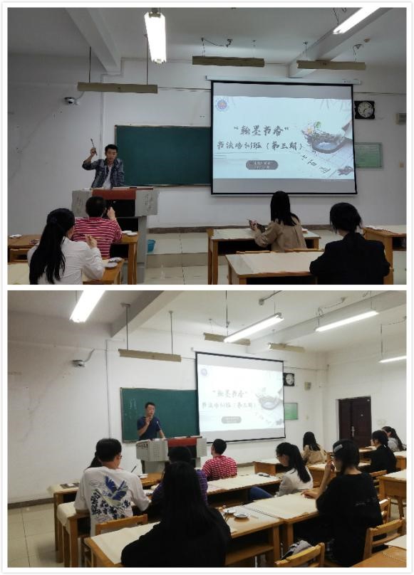 开班仪式结束后,书法培训班老师曹智龙和郝晋暄分别为同学们讲解了书法的基础知识。曹智龙老师依次介绍了纸、笔、墨的种类和特点,并教大家如何正确执笔。郝晋暄老师则具体介绍了欧体、颜体和柳体等楷书字帖的结字特点和章法布局,为同学们提出了一些选择字帖的建议。在随后的练习过程中,老师依次对学员进行了指导,纠正了学员在书写中的不足及存在的问题,使大家受益匪浅。