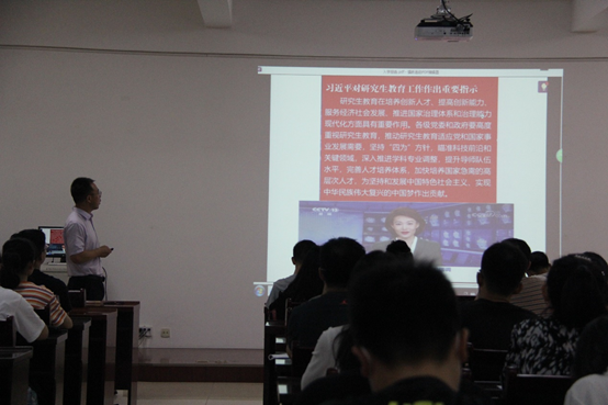 会议开始,为了让学硕班级同学由表及里地认识到成为合格的学术型硕士所需要的条件,席政军老师围绕习近平主席对研究生教育工作的重要指示展开介绍,他提到:我们要成为适应党和国家事业发展需要的人才,研究生教育是要培养造就大批德才兼备的高层次人才,在培养创新人才、提高创新能力、服务经济社会发展、推进国家治理体系和治理能力现代化方面具有重要作用。