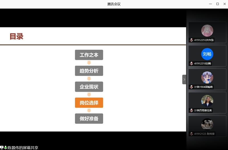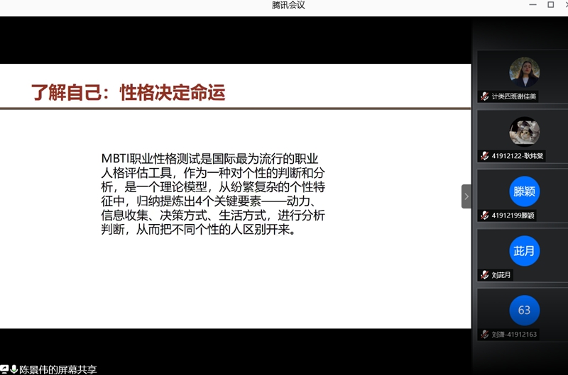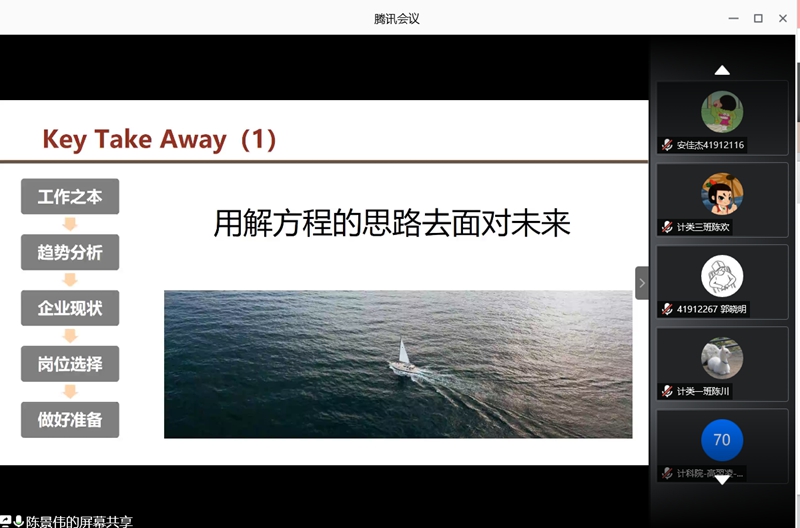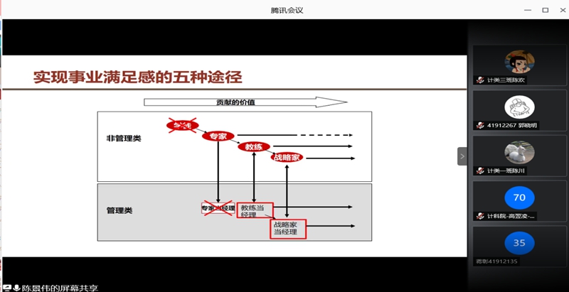 为引导非师范本科生明确职业分类,了解专业发展现状及前景,提前做好个人发展规划,6月7日晚7时,万象城官网本科生举行了“职业分类与专业发展”主题线上指导课程。万象城官网党委副书记袁冰、副院长马苗和联想战略总监陈景伟受邀出席,2019级计算机类全体同学以及部分2017、2018级本科生共计两百余人参加了本次会议,会议由2019级辅导员崔瑜璠主持。