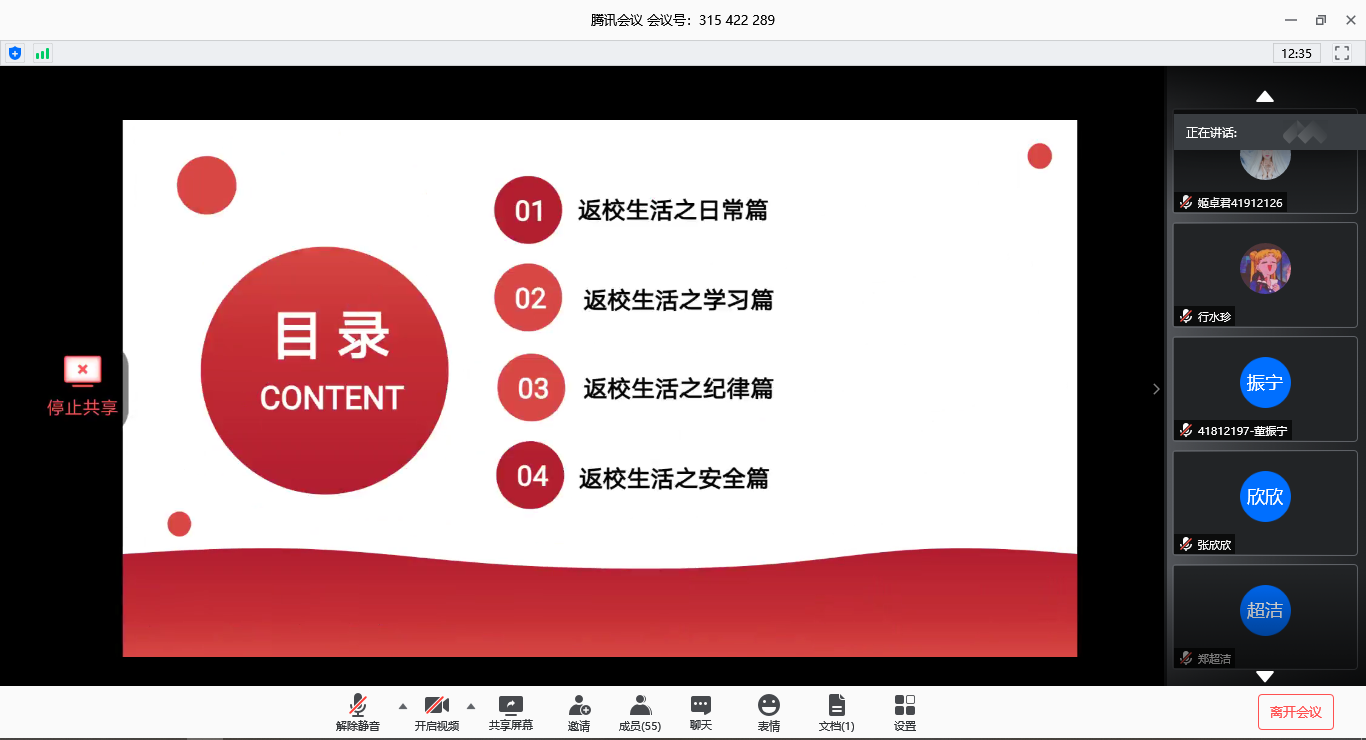 陈应权老师以返校学生日常生活的方方面面为切入点,就宿舍、食堂、浴室、教室、图书馆等与同学们息息相关的场所的管理规定进行了说明。此外,陈应权老师还就学校现在的封闭式管理、每日的三次上报体温以及异常情况的汇报进行了相关说明,并要求所有的返校学生都要能够真正理解并配合学校在疫情期间的相关规定,为学校疫情防控工作做贡献。