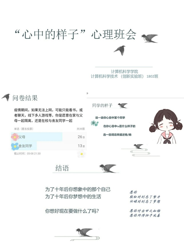 计算机科学与技术(创新实验班)1802班开展了主题为“心中的样子”的线上班会。班会开始,通过分享问卷调查结果和班级同学互动,鼓励同学们发现周围人的闪光点,互相学习。接着利用了“三字接龙”“你画我猜”这两个游戏,来增加同学们的默契度,活跃气氛。班会的最后,主持人播放了短片《马云谈十年后与十年前的思想》,让同学们明确未来目标,提醒大家在学习生活中要做到不忘初心,努力进取。