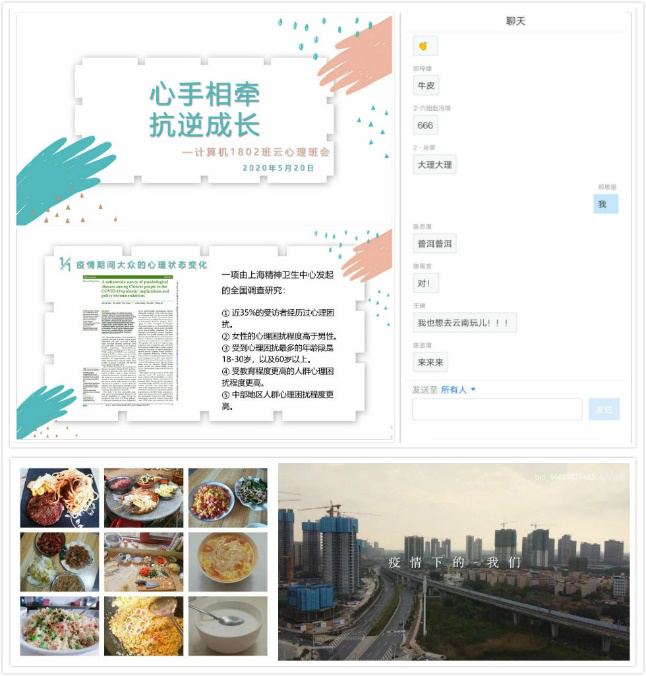 计算机科学与技术1802班开展了主题为“心手相牵,抗逆成长”的线上班会。此次班会特邀请到万象城官网2016级本科生辅导员、心理专干毛庆老师,2018级本科生辅导员安琪老师,2016级心理学院本科生李雨婷共同参与。班会开始,李雨婷为同学们介绍了疫情期间相关心理知识,帮助大家进行疫情期间的心理健康调节。接着进行了心理知识问答竞赛、树洞分享、真心话三个环节,同学们积极参与,主动分享自己的烦恼,并为其他同学提出建议。最后同学们通过一段精彩地视频分享了班级同学疫情下的学习、健身和劳动生活,共同回忆师大生活的点点滴滴,并期盼在师大校园里早日相聚。最后,毛庆老师和安琪老师鼓励同学们,在繁重的学习压力下要学会调节情绪,劳逸结合,健康快乐生活。