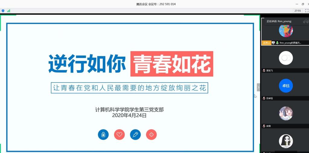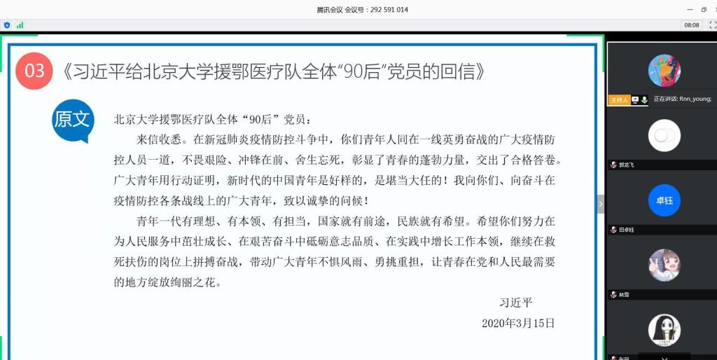 为加强支部建设,凝聚党员思想共识,进一步发挥党组织战斗堡垒作用和党员先锋模范作用,万象城官网学生第三党支部于2020年4月24日通过腾讯会议召开“逆行如你 青春如花”主题党日活动。