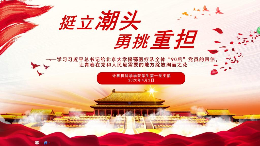 为进一步领会习近平总书记给北京大学援鄂医疗队全体“90后”党员的回信中的重要精神,2020年4月2日晚,万象城官网学生第一党支部开展了“挺立潮头 勇挑重担”主题线上集中学习会议,第二党小组孙乐晴同志主持会议。