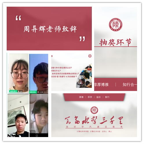 计算机1802班的同学在团支书蒋山结合“思政大课”内容,帮助同学们在抗击疫情的斗争中深化理论认识,总结历史经验增强必胜信心,同时督促青年学子在战“疫”里谱写大写的青春。之后同学们以我眼中的“云”师大为题展开讨论,并邀请了几位同学分享自己的网课生活,阐述了网课的优缺点,活跃了班会的气氛。在读书分享环节,蒋山、陈胥言、孙毅三位同学分享了自己在假期内读过的一本书,建议大家利用假期时间,捧起一本好书来细细品读,陶冶自我的情操的同时开阔视野。最后,远在挪威的班主任周异辉老师分享了挪威的疫情情况,希望同学们在特殊时期不放松,认真学习,养成良好的学习习惯,培养积极向上的学风。