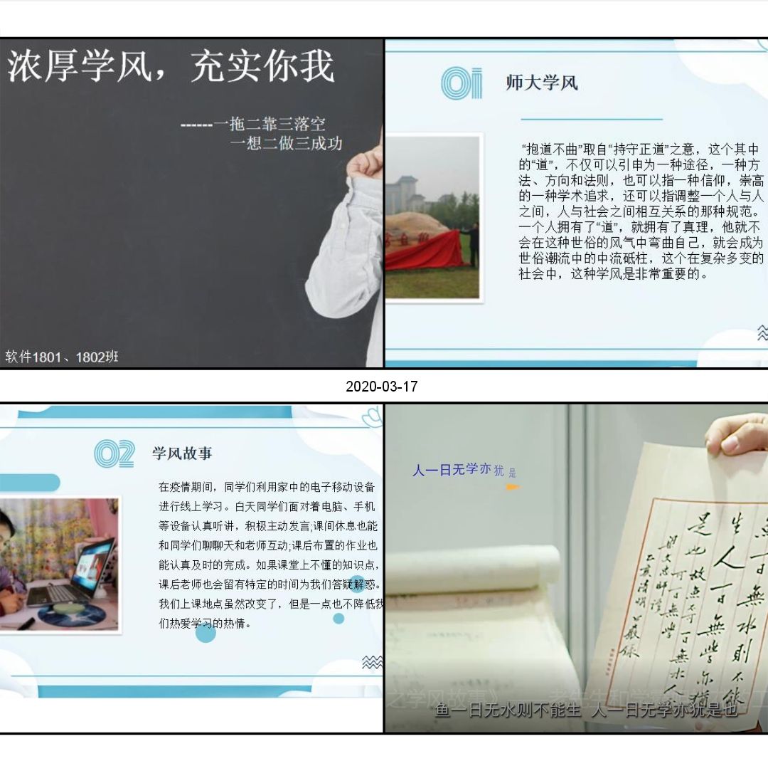 软工1801和软工1802班讲述了何为学风,学风故事以及如何树立良好学风。结合这次疫情,分享了有关良好学风的故事,结合同学们目前网课中存在的问题对同学们提出了建议:网上教学的过程中我们一定要聚精会神,全神贯注,积极在线上向老师请教问题,并做好课前预习。