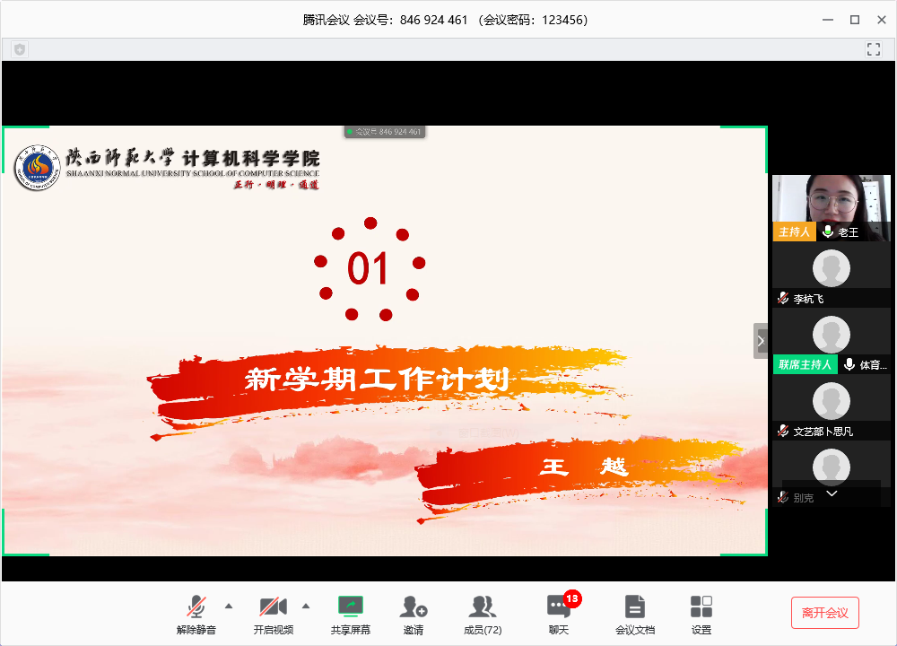 会议一开始,学生会主席王越简要说明了学生会本学期的基本事宜,希望大家重视线上的疫情防控工作;之后通过分享西安良好近况,鼓舞大家信心,并且督促大家认真进行线上学习,抓住时机提升自己。