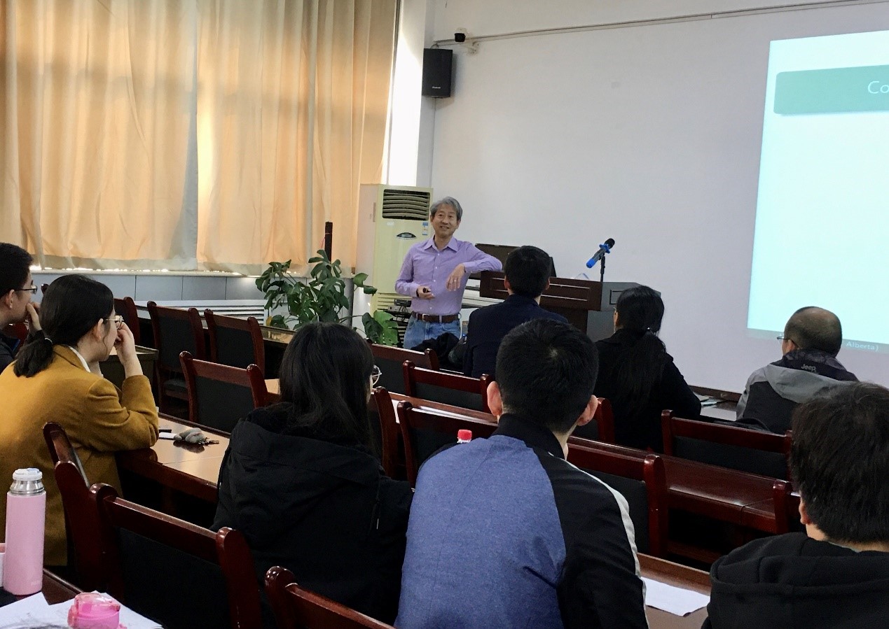 报告开始,Yang教授向在座人员介绍了阿尔伯塔的经济、人口、温度和当地经典建筑以及阿尔伯塔大学的生活与学习环境。Yang教授谈到他所做的课题——海底摄像机,讲述了海底摄像机的参数以及新型3D海底摄像机的构造、参数、原理及3D重建并介绍了海底图像中光的散射处理、距离评估和透明性等。在提到现在的进展和所遇到的困难时,他指出了未来的构想与工作。部分老师结合自身研究领域的相关问题和Yang教授进行了交流与探讨。活动结束后,老师们合影留念。