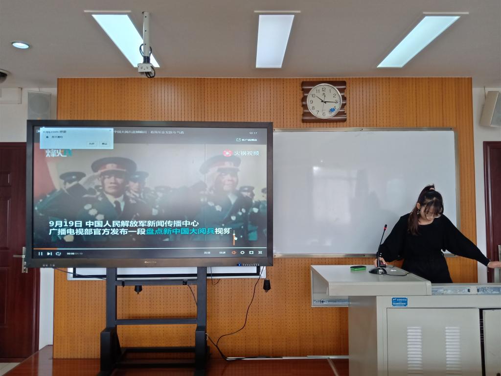 首先,团支书宋澳华带领全班同学回顾了国庆70周年阅兵式和历次阅兵最震撼镜头。一幕幕动人的画面,一首首熟悉的旋律,唤醒了一段段珍贵的历史记忆。新中国成立70周年以来的艰苦奋斗的历程和举世瞩目的辉煌成就,激发了青年团员的爱国热忱,点燃了他们的青春激情。