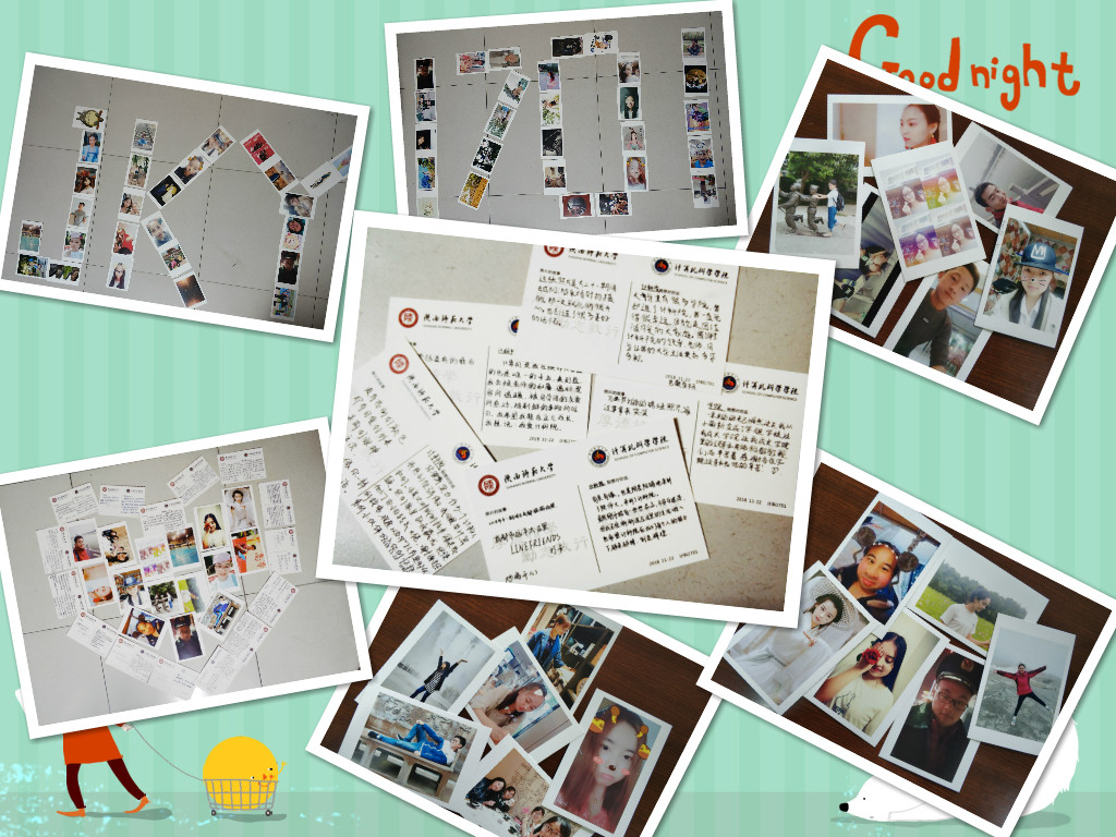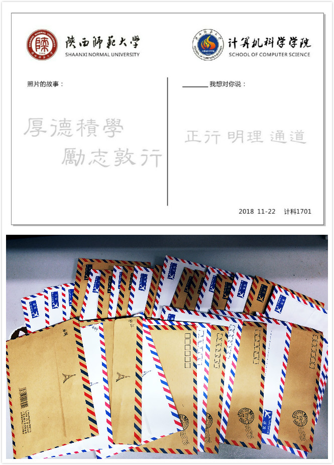 自2017年初次来到师大,与万象城娱乐awc线路相遇,至今已经一年,一年中发生了许许多多的故事,有的感人,有的热烈,每位同学都有些心里话想要对自己的伙伴,对自己亲爱的导员,对计科一班这个温暖的集体说,对培养我们的万象城娱乐awc线路说。这次团日活动为大家提供了这样的机会,每位同学都积极参与并选择自己拍摄的图片设计明信片,每一张明信片都是独特的同学们提供图片,有自己的照片,有陕师大的美景,有自己喜欢的明星偶像,有自己设计的卡通人物,都记录了每位同学一年中的珍贵回忆。定制成明信片,写出自己对学院、导员、班级、同学们想说的话,在明信片的背后我们写出了自己的心声,字字句句皆是真情。这些明信片都将由团支书进行汇总送达。还有一封“写给未来的自己”的信,团支书将在毕业的时候发还给大家,给大家一个未来的惊喜。
