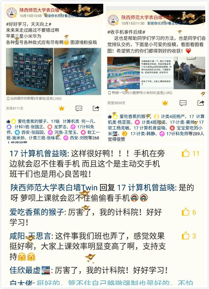 万象城官网2017级辅导员陈应权、2018级辅导员安琪在晚点名时号召同学们在课堂上“暂别手机,专心听讲”,不做“低头族”,打造“无手机课堂”,各班也安排相关同学负责手机收纳、保管和发放工作。学院希望通过此举使同学们逐渐养成课堂上暂别手机、暂别网络的习惯,将更多的注意力集中在学习上,从而引导学生提高自我管理、自我约束、自我规划的意识和能力,让同学们受用终身。对此,同学们也表示:“上交手机后我们更加专注,课堂效率大大提升”“手机袋的存在可以避免我们上课玩手机,从而将我们的注意力集中在课堂上,我认为非常有必要”。