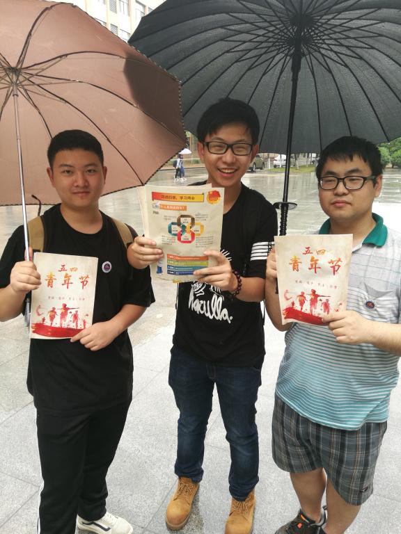 虽然阴雨绵绵,但是无法减弱同学们的活动热情。本次团日活动主要分为两个时期:在活动的准备时期,部分同学主要进行宣传单的设计,共设计三个款式的宣传单,主题为“五四精神”与“四进四信”,为我们此次的团日活动的开展做好充分的准备;活动当日,同学们按照先前分好的小组,领取院徽和宣传单,各个小组前往学校不同的区域向路过的师大学生们宣传五四精神四进四信相关知识,并以摄像的方式做好记录。团支部成员们在宣传的同时,自身更是得到了充分的学习,本次团日活动的成果显著,这次五四青年节也是充实丰富。