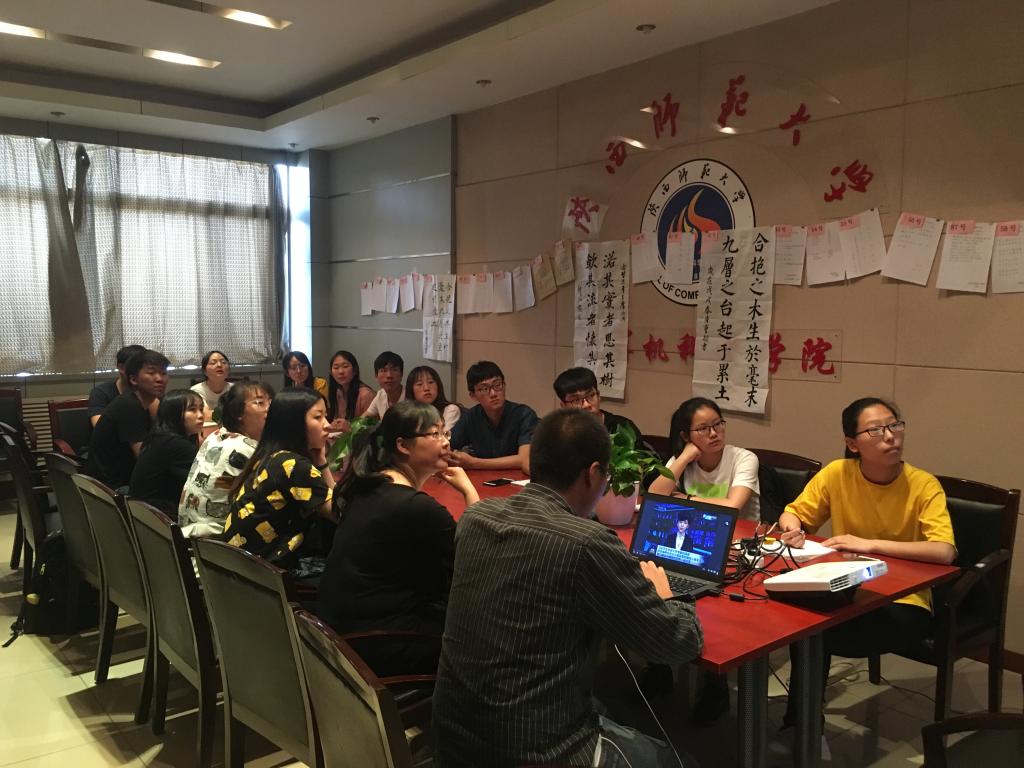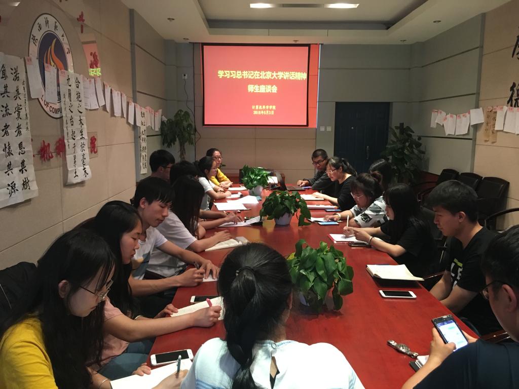 5月3日下午,万象城娱乐awc线路在文津楼学院会议室召开了师生座谈会,组织师生代表收看了习近平总书记在北京大学考察的新闻报道,集中学习了习近平总书记的讲话精神,学院团委书记郭康凌、学生会、研究生会、计算机科学协会、新闻中心、新校区团支部书记、研究生党团负责人、马列理论读书社社员代表等30余人参加了此次座谈会。座谈会由学院马列理论读书社社长冯苗苗主持。