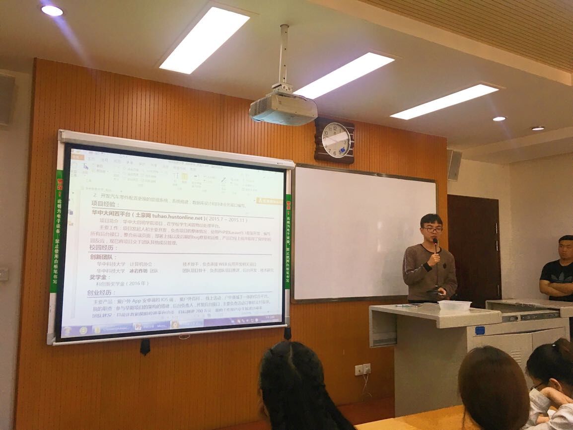 本次讲座的第一位主讲人是2014级软件工程专业的郭浩东同学,目前拿到了滴滴打车和京东两家公司的offer,最终选择了京东。郭浩东主要为同学解答了找工作的相关问题。他向同学们分享了自己的求职之路和三份不同学长学姐的求职简历,分析了其中的优缺点,告诉同学们简历内容要避免华而不实,将硬件内容写到位。