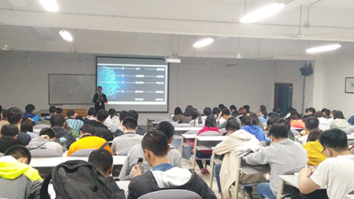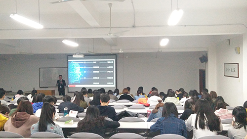 本次讲座主要分为三个部分:人工智能的前沿应用,人工智能的技术架构和大学生生涯规划。讲座开始,吴松老师通过“阿尔法狗”和“小度”等人工智能应用的例子引入主题。关于人工智能的前沿应用,吴松老师介绍的有:索菲亚(历史上首个获得公民身份的机器人)、京东无人仓库、亚马逊无人机派送快递等。这些前沿应用向同学们生动地展示了人工智能的发展。随后,在人工智能的技术框架部分,吴松老师介绍了四部分内容:模式识别、知识工程、自动工程和人机对弈。就知识工程中的新闻撰稿,吴老师提到,现在百度上许多文章都是机器生成,而非撰稿人编辑得到的,人工智能编写新闻,好处在于具有时效性,可以在很短的时间里,编写出易于理解的新闻。最后,吴老师对以后想要从事人工智能的同学进行了生涯规划,他建议,数学功底较好的同学可以从大数据分析方向进行研究,而数学一般的同学可以从Python入手。