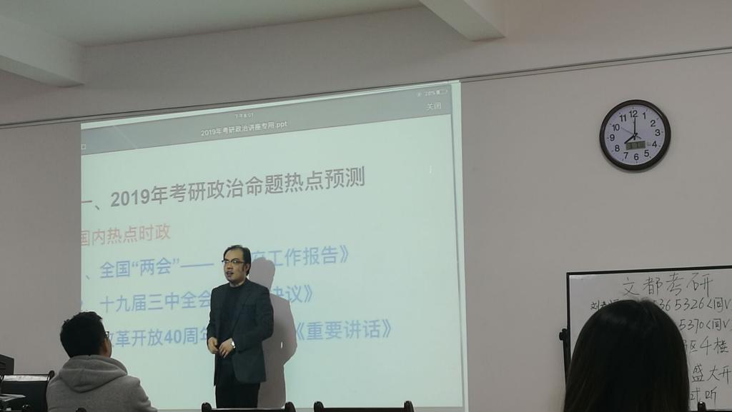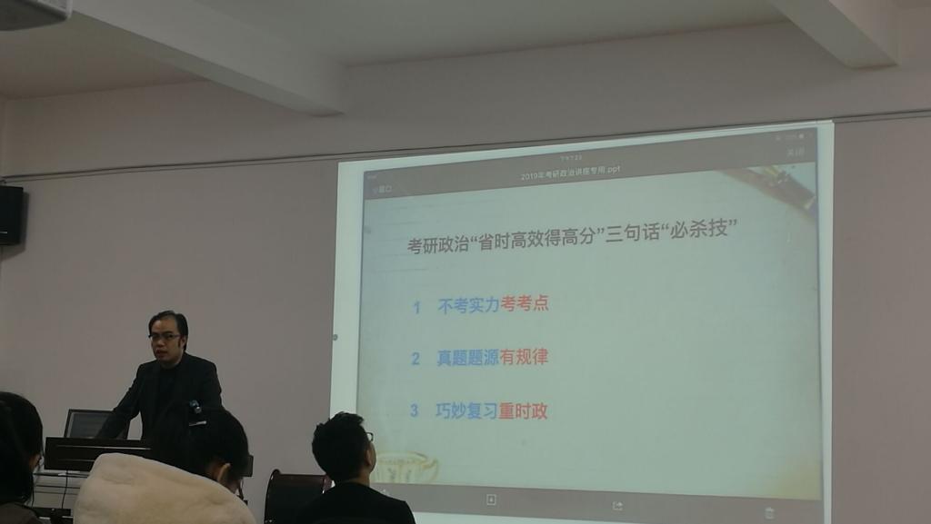 本次讲座的主讲人是万磊老师。讲座上,万老师首先从当今考研形势开始分析,向大家介绍了近些年的考研情况,他提到近年来绝大部分考研学生都具有努力好学、勤奋上进的精神。并呼吁我们的同学以饱满的精神来准备考研。接着,万老师为同学们讲解了考研政治的出题形式及备考方法,同时也讲解了一些政治真题和考研时政。万老师建议同学们在政治复习中要听多看,避免无效率地机械学习。最后,万老师跟大家分享了自己的考研经历,他告诉同学们考研是个持久战,同学们要打起精神,锲而不舍,同时要安排时间,积极备战考研。