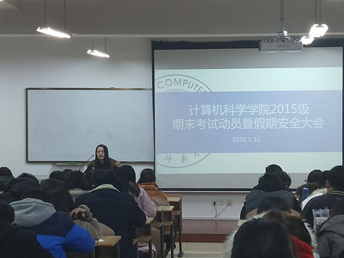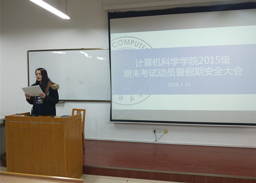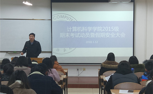 为保证同学们在期末考试中遵守纪律,在假期中注意安全,2018年1月12日晚上8:00,万象城官网2015级全体学生在文津楼3324教室召开期末考试动员暨假期安全大会。2015级辅导员赵志博老师、吉晨晓老师出席并主持了此次大会。