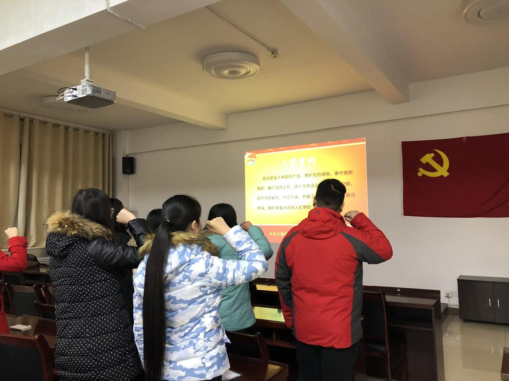 宣誓仪式在庄严雄浑的《国际歌》旋律后开始,支部委员蒋欢郑重地宣读了预备党员宣誓名单。随后,在预备党员孙慧颖同志的带领下,8名预备党员右手握拳举过肩头,面向鲜红的党旗,逐句庄严宣誓。