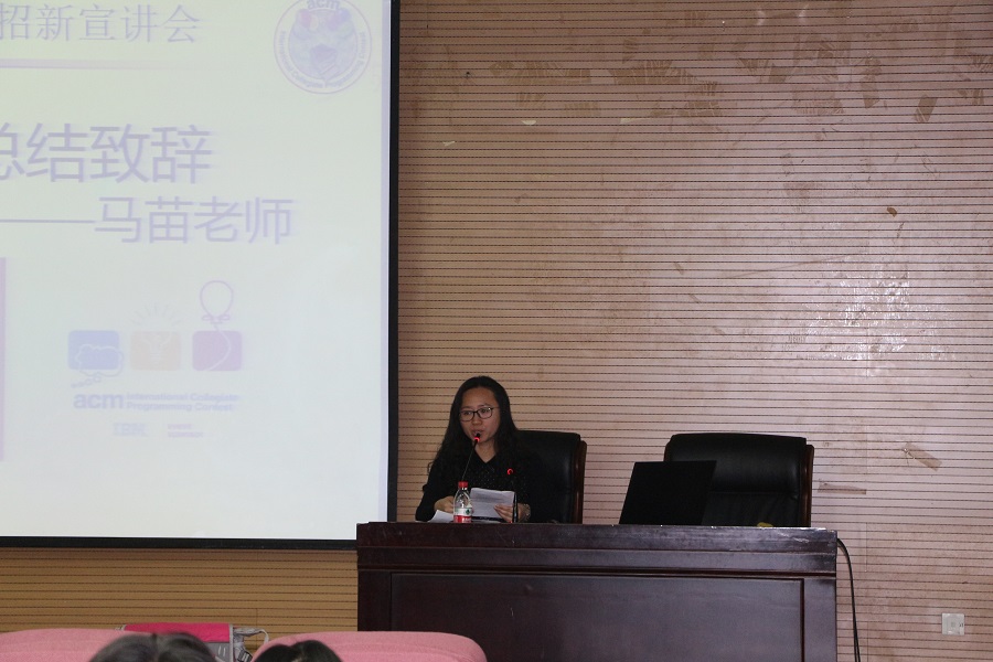 宣讲会最后,万象城娱乐awc线路副院长马苗老师讲话。马院长肯定了ACM竞赛的重要性,深入剖析了ACM竞赛对信息类专业教学模式带来的推动与促进作用,并表示学校与学院也将更加支持万象城官网ACM竞赛的发展。她鼓励同学们热爱专业、刻苦钻研、勇于创新,鼓励同学们积极参加ACM竞赛,拓展自身专业能力,增强自身专业水平。