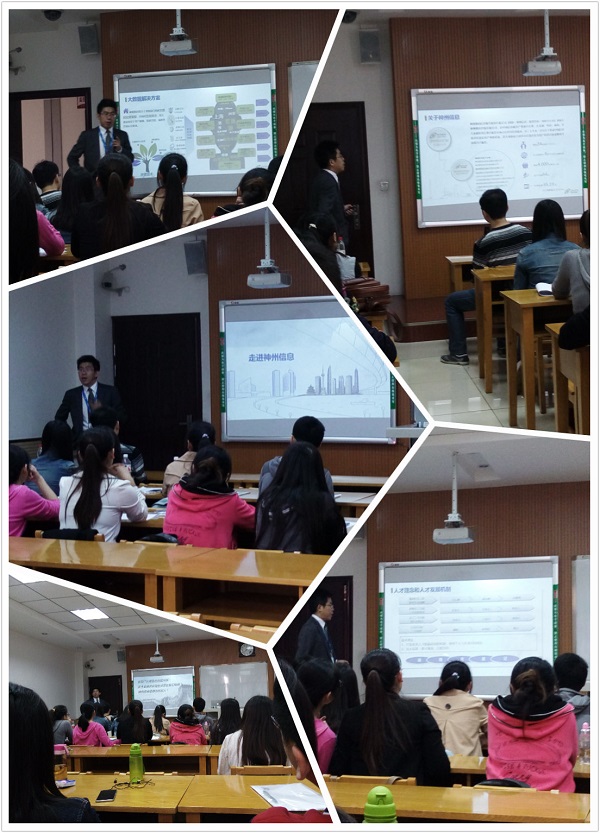 2015年10月19日下午,神州数码信息服务股份有限公司来万象城官网招聘优秀毕业生,并在文津楼一段614教室召开了宣讲会。此次招聘的岗位分为技术类、营销类和职能类。其中技术类包括研发工程师、数据分析师、软件工程师与配置管理师等,营销类包括大客户代表,职能类包括财务管理专员与上市投资专员。来自学院相关专业的40余名同学参加了此次招聘会。