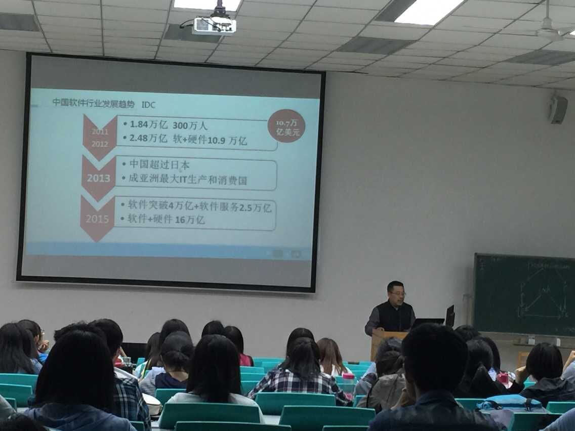 深蓝软件公司是西安软件园认定的软件人才培养机构,是国家商务部"千百十"工程人才培养机构,这次的主讲人是深蓝软件开发公司的资深老师南敏庚会议伊始,南老师向大家介绍了现阶段世界互联网的发展情况,及软件发展过程;接下来又介绍了应聘软件企业的学生需要的硬件条件对大家说,首先扎实的基本功很重要,对于计算机专业学生来说未来想要获得一份好的工作,需要精通一到两门程序语言和工具,同时也要十分热爱程序,及较强的团队协作能力,才能更好地适应企业环境。计算机专业学生就业流向大致都集中在北上广地区,主要原因是这些地区就业机会多,薪资高。最后蓝老师向大家建议到练好基本功,达到企业需求,弥补与企业要求之间的差距。接下来的老师向大家介绍就业经验。他讲到,首先要多参加招聘会,向招聘方展示自己的专业技能,让别人知道你的能力,将自己成功的推销出去; 南老师还通过一些实例向大家介绍如何成功的就业。