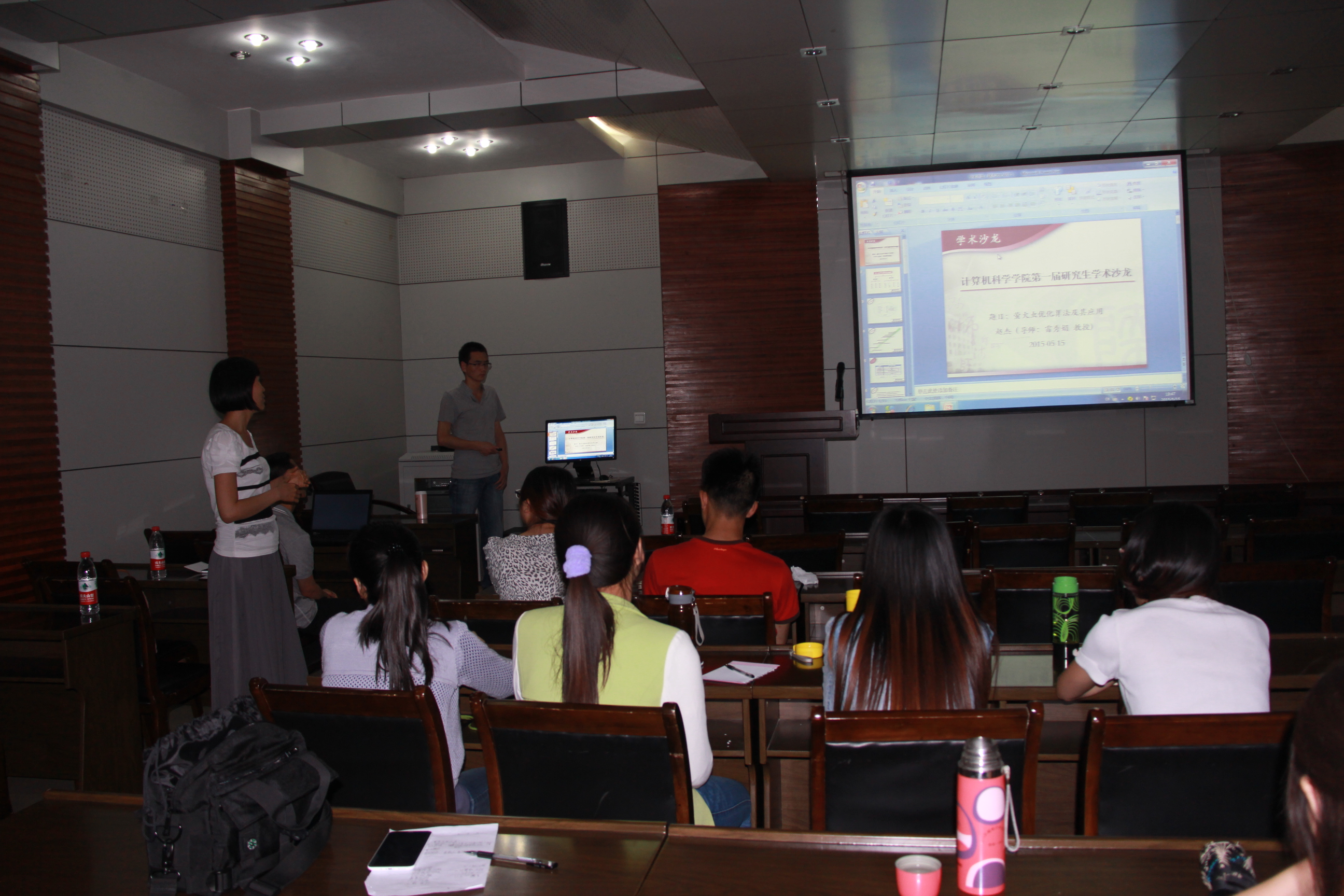 赵杰首先做了题为“萤火虫优化算法及其应用”的报告,主要介绍了在研究生期间自己所做的学术研究及成果。依次按照算法概述,仿生原理,算法描述与算法优缺点的次序做了介绍。算法概述与对仿生原理的讲解部分,将自然界中蚂蚁,蜜蜂与萤火虫等动物的行为与算法的数学原理相结合,语言生动,引起了在座师生的兴趣;在算法描述部分,他的讲解详细,清晰易懂。最后,肖冰老师对报告进行了总结与点评,在座师生积极提问,并展开了深入讨论。