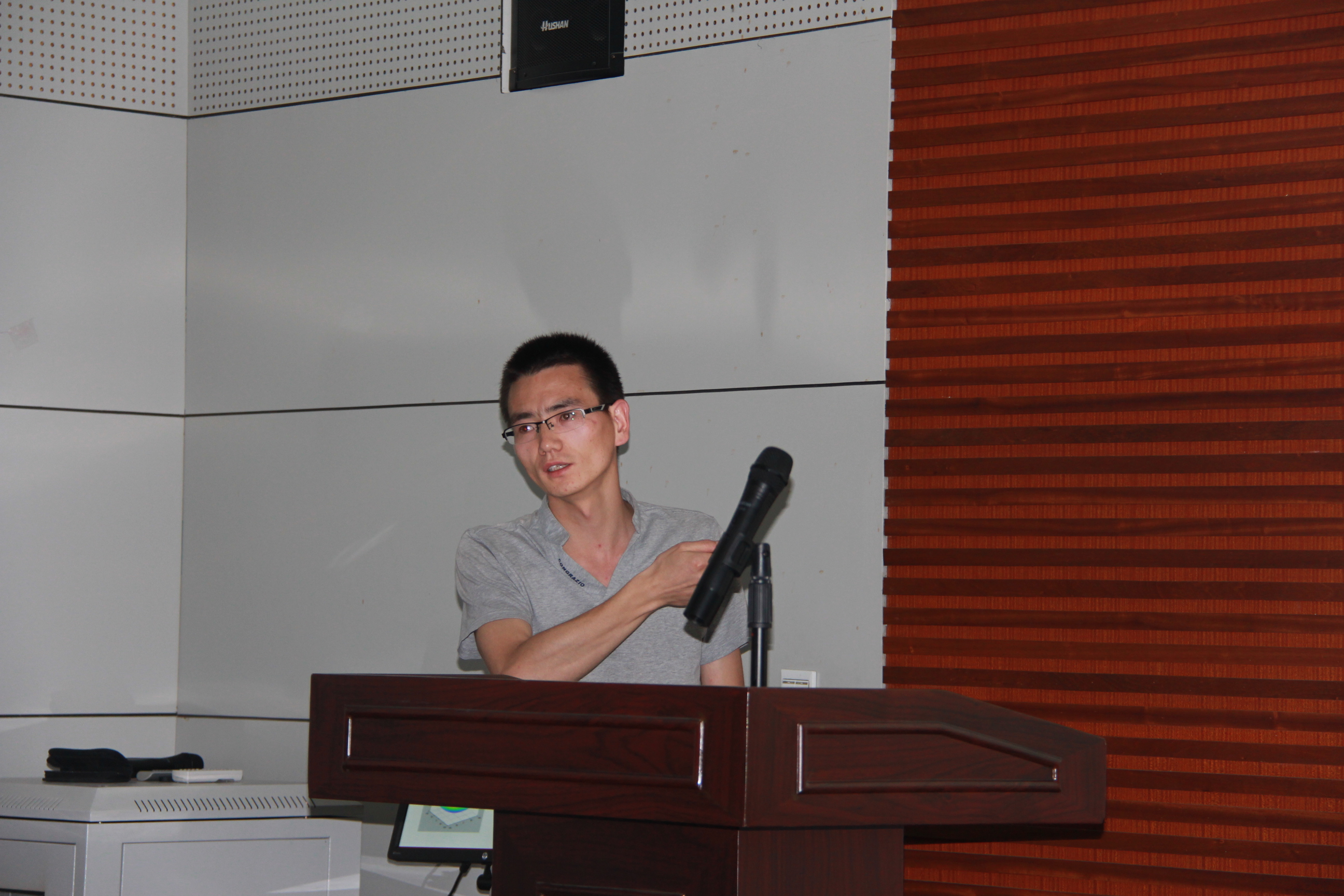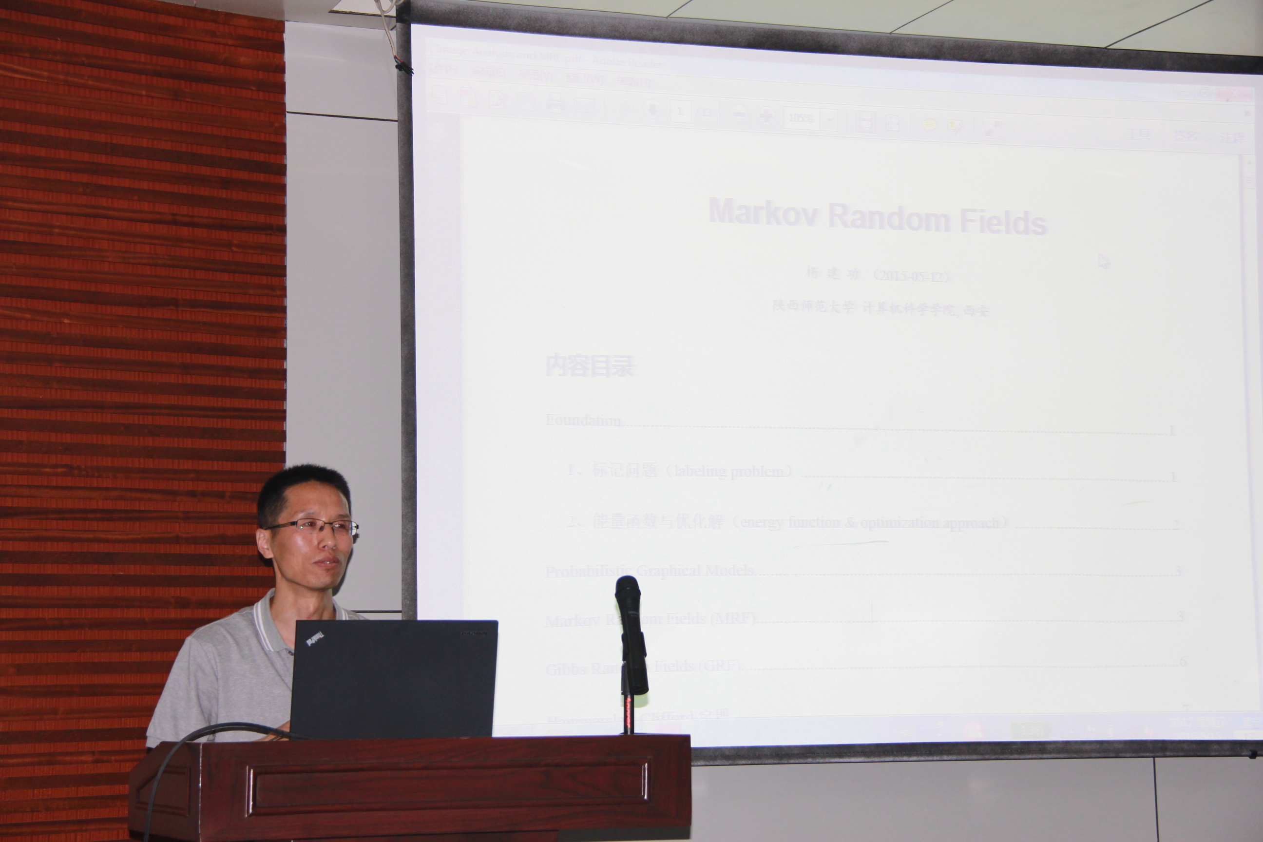 杨建功博士的报告则是更深入地介绍他目前正进行的研究,报告题目为“马尔科夫随机场”,首先引入了了标记问题与能量函数优化解概念,继而介绍了马尔科夫随机场,Gibbs随机场与Hammersley-Clifford定理,讲解过程中,杨建功博士针对复杂的数学概念与他自己在研究中遇到的问题进行详细介绍,最后,杨博士介绍了马尔科夫随机场的一例具体应用。报告结束后,肖冰老师作了点评,在座师生积极提问,杨老师也耐心地一一解答。
