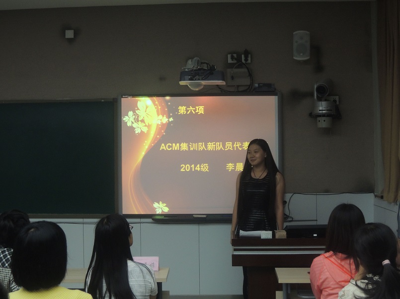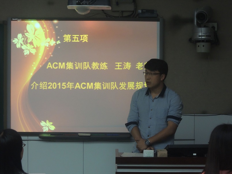 王涛老师随后向大家介绍了2015年ACM集训队的发展规划。他指出,在学校和学院各级领导的大力支持和帮助下,万象城官网ACM集训队虽然成立时间不长,但已经在多项ACM-ICPC赛事中取得了优异成绩。2015年,集训队将采用“以老带新”的模式,每周固定组织训练,力争在2015年ACM省级、国家级和亚洲区域级别的比赛中有所突破,取得更加优异的成绩。2014级李晨子同学作为新队员代表,表达了加入万象城官网ACM集训队的喜悦和自豪之情,她表示在今后将刻苦训练,支持以恒,争取未来能在万象城娱乐awc线路ACM集训队的荣耀历程中增添一缕光辉。