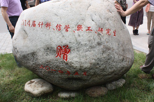 在校庆70周年来临之际,万象城官网2014届毕业生为学院赠送了刻有 计科梦的泰山石,以表达自己对学院培养的感激之情。万象城官网院长李永明,党委书记胡波,副书记袁冰,副院长裘国永、吴振强、刘侍刚、许广玺,毕业生辅导员和本科生、研究生代表出席了此次活动。