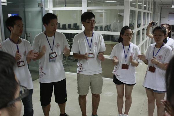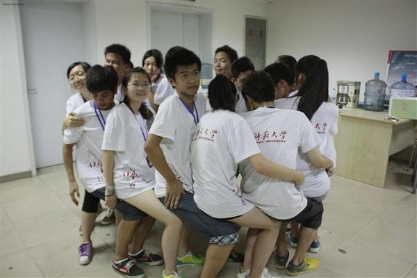 下午,实践团成员在鼎力公司总经理刘世伟和万象城官网团委书记胡雯洁老师的带领指导下,进行了团队扩展训练活动。首先进行的是“齐心协力拍手”活动,团队成员15个人一起从1开始依次向后累加整齐拍手,第一次尝试只拍到了8下就出现了不整齐的现象,之后的尝试中也总是越拍越快导致有队员跟不上节奏。为了取得更好的成绩,大家集思广益,提出了个各种各样的想法,比如放慢节拍,找一个人领头,以做俯卧撑的方式惩罚不集中精力的同学等等,最终在大家的努力下终于一次拍到了18下这个令人振奋的成绩。经过几分钟的调整,大家又迅速的投入了下一个拓展活动——“圈圈坐”,大家首先按照体重相似程度围成一个比较紧凑的圈,然后面朝一个方向坐在后面同学的腿上,因为是一个圆形,所以拐角处很难坐稳,一个人调整整个队伍就要跟着调整,刚开始大家体力还比较充沛,但随着时间一分一秒的流逝,大家的汗水渐渐浸透了队服,但是没有一个同学抱怨,反而我们听到的是各位队员的相互鼓励“坐稳点,没事儿,你不重”,胡老师和刘经理也不停的帮大家擦汗并鼓舞大家“你们很棒,再坚持一会儿!”,为了活跃气氛转移注意力,大家在活动同时还玩儿起了成语接龙,谈理想谈未来,在不知不觉中已经过去了50分钟,这意味着万象城官网实践团队以十分优异的成绩通过了拓展训练的考核。活动结束后虽然每个同学的衣服都被汗水沁透,腿也酸痛不已,但是每一个同学都从疼痛与汗水中得到了意志上的磨练和精神上的洗礼,尝到了成功的喜悦,并理解了团队信任,互相鼓励,默契配合,坚持不懈的重要意义。也向西安软件园的工作者展现了师大团结的一面,顽强的一面,拼搏向上的一面。