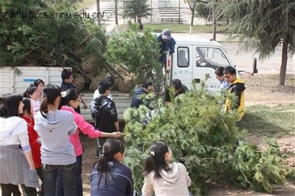 大约下午两点,软工班学生和物业部门的工人一起将树苗从车上卸下来,树苗笨重,所以这部分工作主要是由男生一起协助完成,将树木从车上卸下来之后,男生们两人或三人一组分别将树苗往坡上的坑里运,这是一项累人的工作。虽然树苗沉重,但是女生们也有尝试,颇有巾帼不让须眉之风范。树苗运到坑里之后,由女生们对树苗进行扶正填土。
