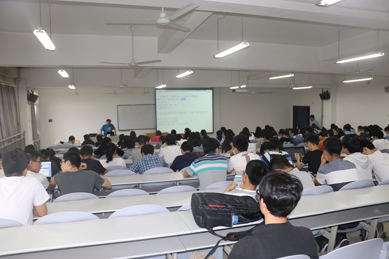 讲座开始,雷老师为同学们大致讲解了当今就业形势以及深蓝软件团队主要专攻的领域,让同学们大致了解了一些关于就业后自己所能从事的领域。接着,雷老师以幽默风趣的语言,结合具体题目,为同学们讲述了一些著名公司面试笔试题型的答题方法和技巧。他主要选取了五道关于百度、阿里巴巴、腾讯等著名公司招聘的笔试题目向同学们做了详细的解答,在讲解过程中,他以通俗易懂的语言向同学们一步步讲解题目,同时现场向同学们熟练地演示程序调试运行过程。同学们听得非常认真,也积极与老师互动,现场回答老师提问的问题。最后,雷老师从笔试题目的解题过程中总结了一些解题的思想,使同学们收获颇丰。
