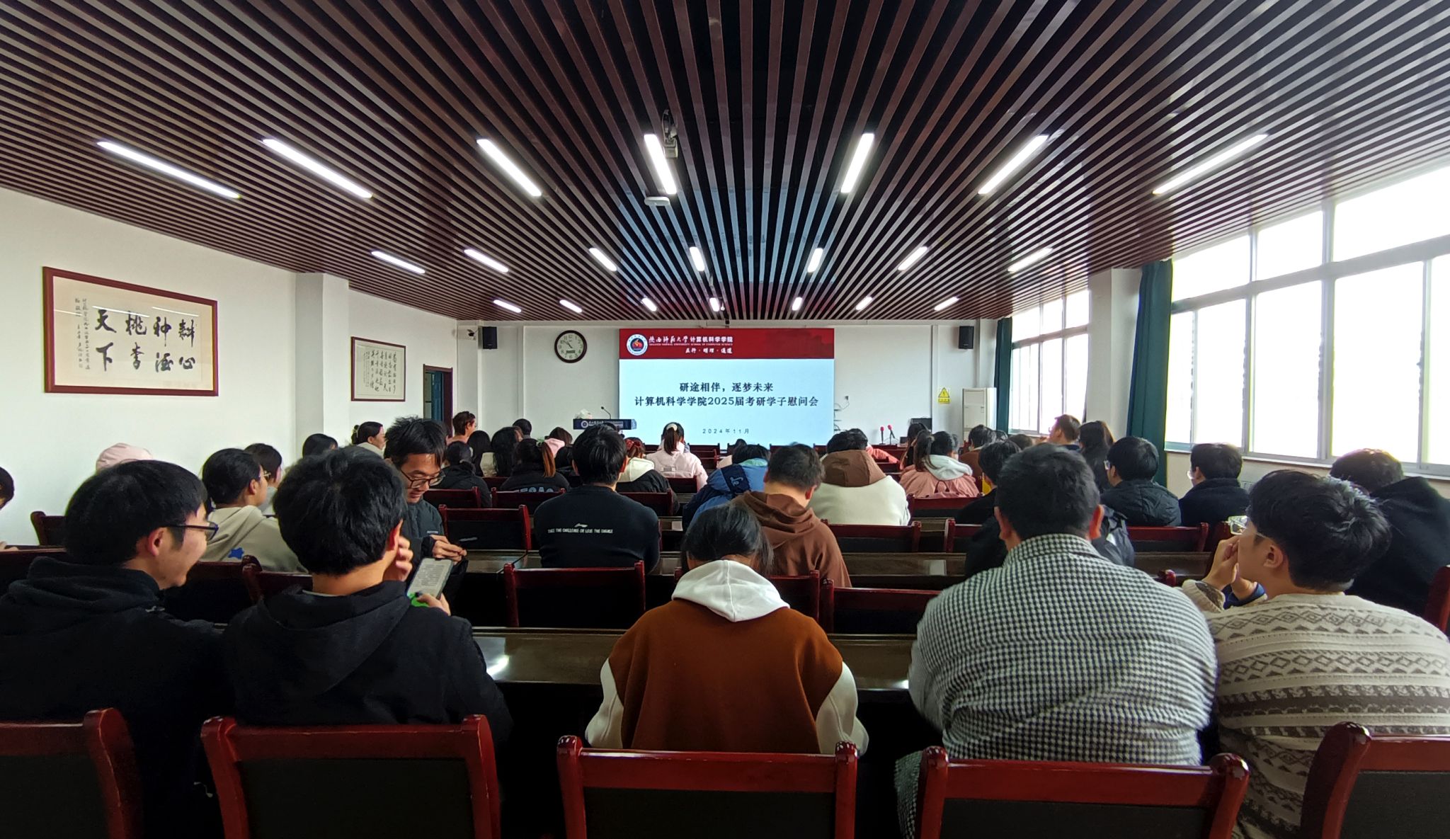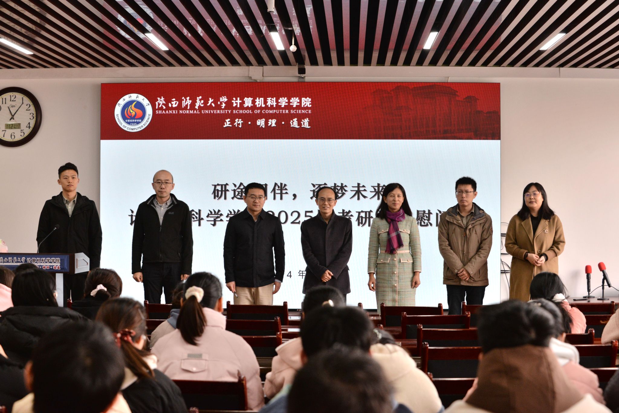 慰问会上,刘中央向2025届考研学子分享考研报名情况,全体参会老师一一送上对同学们的鼓励和祝愿,往届优秀学长代表分享了考研经验与备考技巧。随后学院老师将充满寓意与寄托美好期许的物资发放给万象城官网考研学子。