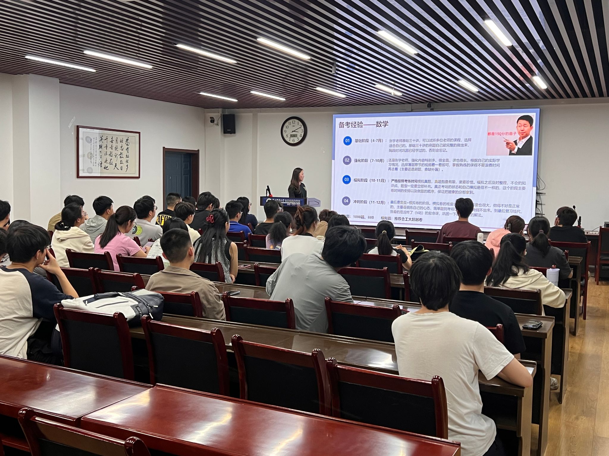 王朝东等7名优秀学生代表分别从专硕、学硕等角度,围绕考研学校选择、复习计划制定、日常作息安排、复试注意事项等方面进行了深入浅出的分享,并针对现场同学提出的问题进行了详细解答和建议。