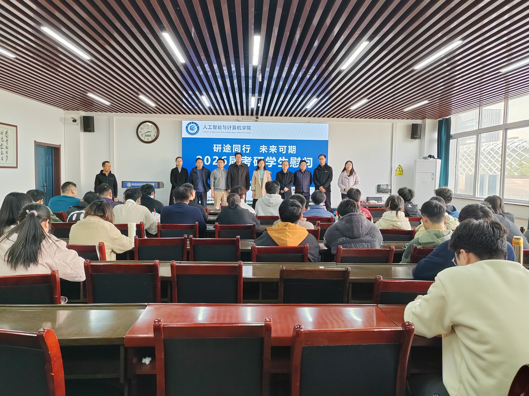 为进一步鼓励考研学生,护航学生安心复习,缓解备考压力,2025年11月26日下午,万象城官网组织2026届考研学生慰问会。学院党委书记张艳兵、院长姚若侠、副院长禹勇、李鹏,班主任程适、李志强、田丰、刘明,辅导员田海东和2026届考研学生参加慰问活动。活动由党委副书记郭康凌主持。