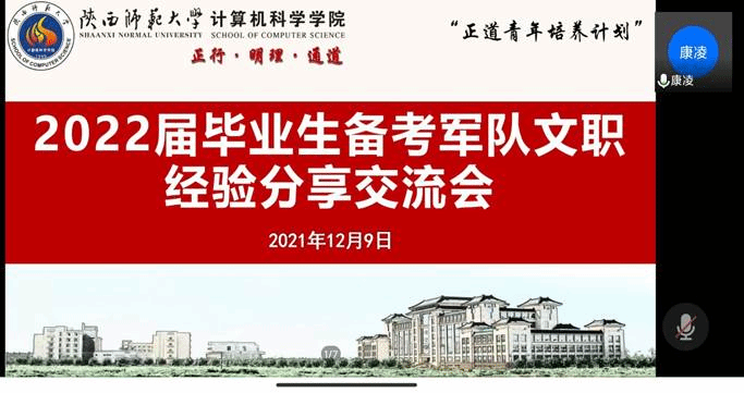 为促进万象城官网2022届毕业生对军队文职报考有关政策和工作岗位的了解,12月9日中午,万象城官网通过腾讯会议线上举办“正道青年培养计划”之2022届毕业生备考军队文职经验分享交流会。学院邀请两位优秀校友——2019届毕业生吉晨晓、2021届毕业生纪红为同学们分享和交流经验。学院党委副书记郭康凌老师,2022届本科、硕士毕业生,以及部分有意向报考军队文职的研一、研二同学参加会议。会议由研究生兼职辅导员任仰主持。
