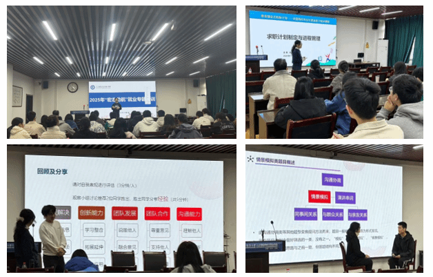 杨媛以《求职计划制定与进程管理》和《秋招春招规划及心态调节》为主题,结合计算机专业特点,系统分析了就业形势与求职环节。杨媛分析了当前就业形势,指出在数字化转型背景下,计算机专业学生除技术能力外,要高度注重综合素质培养,解读了企业招聘关注的专业素养、解决问题能力、团队协作精神等核心素质。针对个体面试,杨媛从面试前准备、现场表现到后续跟进进行了全方位指导,分享了应对压力面试等特殊形式的技巧。通过模拟演练,她从礼仪、逻辑到内容深度进行专业点评与演示,帮助学生掌握面试要领。在群体面试环节,她系统讲解了无领导小组讨论的考核要点,指导学生找准定位,平衡个人价值展现与团队协作。实战演练后,她针对每位同学的表现给予细致反馈。杨媛从心理学角度分析了求职常见心理问题,提供系统调适方法,强调保持积极心态,将每次经历视为成长机会,帮助学生建立健康的求职心态。