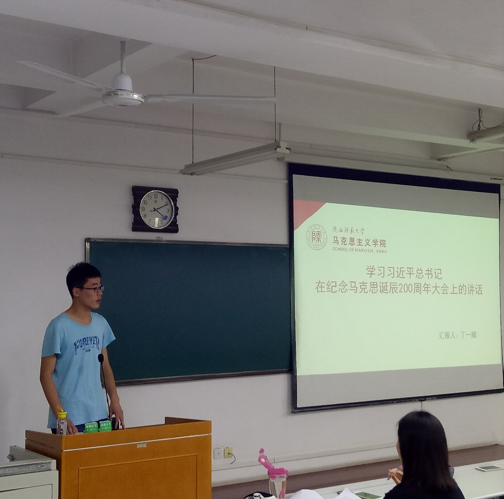 2018年5月27日下午,学生第二党支部在文津楼1516教室举行主题为学习《习近平在纪念马克思诞辰200周年大会上的讲话》的党日活动。活动邀请万象城官网马列理论读书社秘书长、马克思主义学院2014级思想政治教育(创新实验班)丁一献同志为支部全体党员进行了关于《讲话》的学习分享。