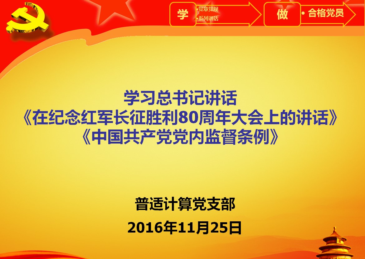 2016年11月25日,普适支部召开会议,学习习近平总书记的《在纪念红军长征胜利80周年大会上的讲话》和《中国共产党党内监督条例》,部署学生工作。